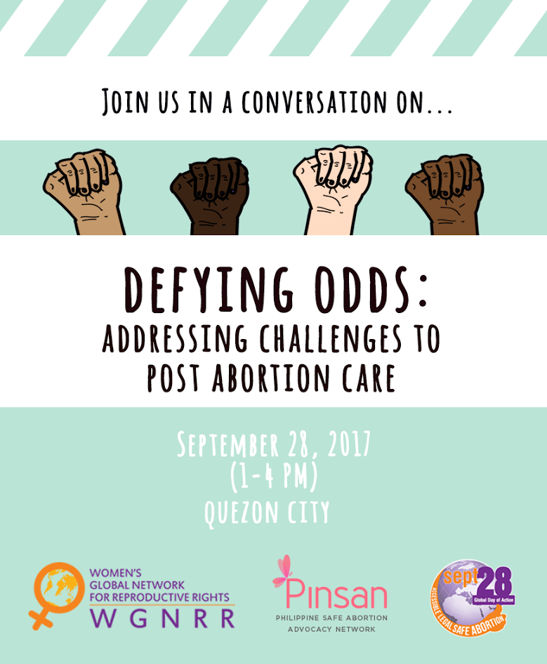 The Philippine Safe Abortion Advocacy Network (PINSAN) and WGNRR will hold an afternoon of conversation with women and human rights groups, health providers, educators, and youth entitled Defying Odds: Addressing Challenges on Post-Abortion Care on September 28 (1-4 pm) in Quezon City.
